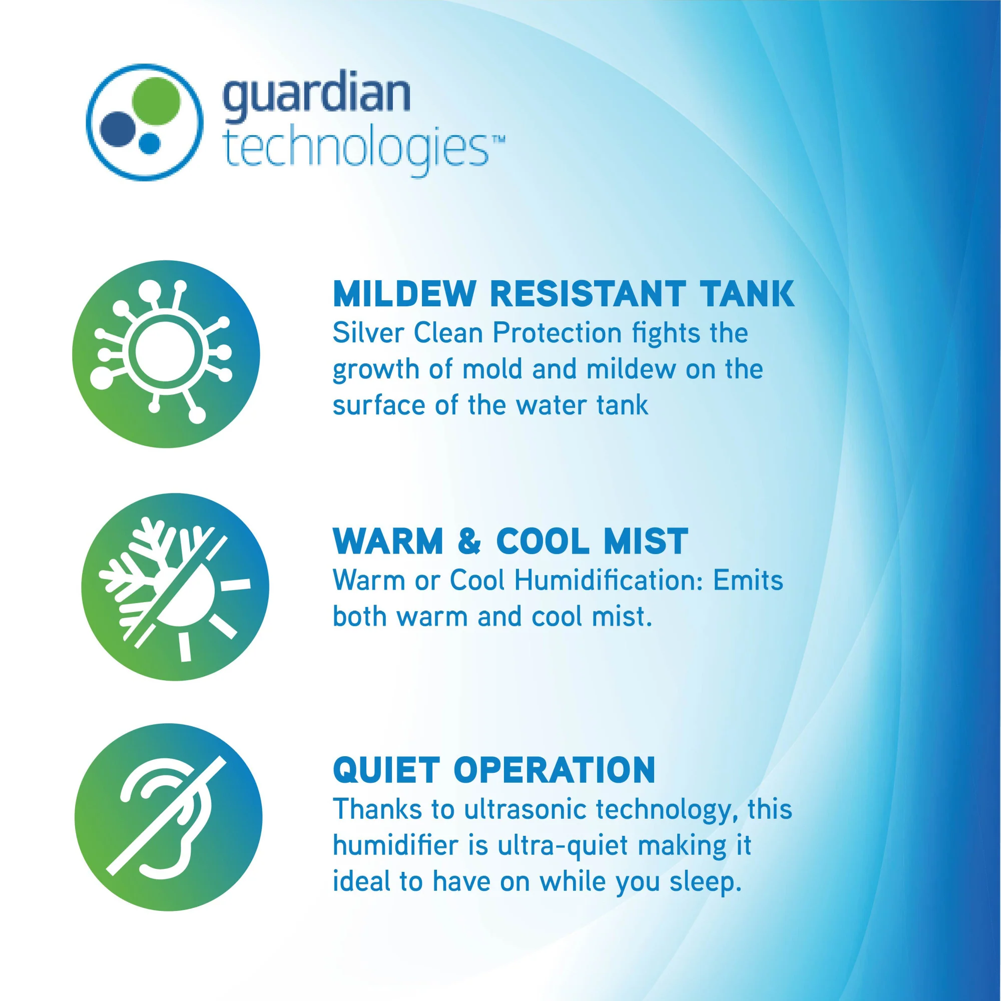 The 90-hour* Ultrasonic Warm and Cool Mist Humidifier guards against problems caused by dry air in the home. It features an easy to fill large 1.32 gallon tank, ideal for use in medium sized rooms. Silver Clean™ Protection is embedded in the tank to help keep the water tank cleaner longer. Thanks to ultrasonic technology, it disperses a fine warm or cool mist into the air, which can be extended using the wands. It is ultra-quiet making it ideal to have on while you sleep. Smart mist sensor monitors the level of humidity in the room and adjusts to your selected level. The humidifier is equipped with an easy to use digital display, a night light, timer and 3 speed mist control. A low water indicator light lets you know when it's time to refill the water tank. PureGuardian® humidifiers create a better home environment for those suffering from colds, allergies and dry skin. Note: Run time is based off of running the unit on low setting and cool mist, also depends on atmospheric conditions.